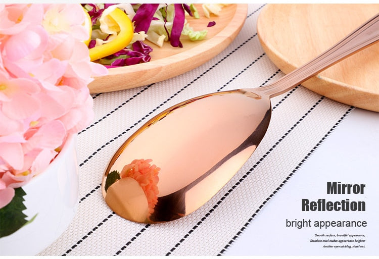 This Durable Tableware Spoon high polish finish, a smooth edge with no rough spots and will never cut your hands. Convenient to use and perfect for dinner parties, buffets, and family-style dinners. Perfect for serving salads, barbecues, picnics, etc. It is also a good gift for your friends and relatives, or people to move to a new house. It can impress your guests.