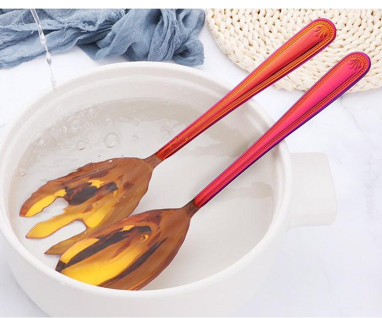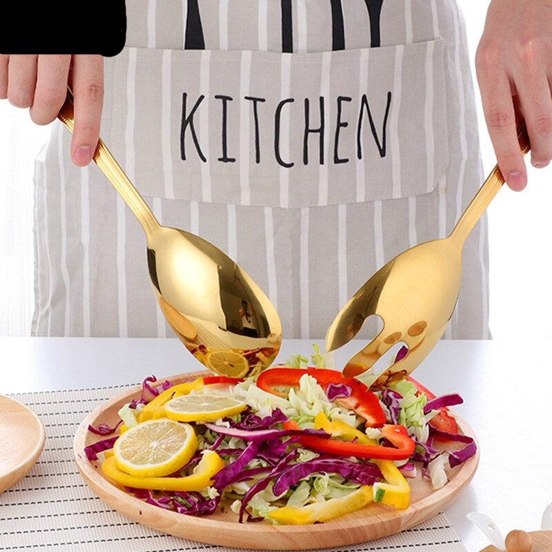 Our 2-Piece Salad Spoon serving spoon and fork set can be used separately to serve a variety of foods on the table as well. Made of 18/8 stainless steel that guarantees your health, is durable enough for basic daily use, is rust-resistant, and durable for years to come. Shiny metallic appearance with mirror polish and vivid color, don't worry about the PVD color fading or peeling off.