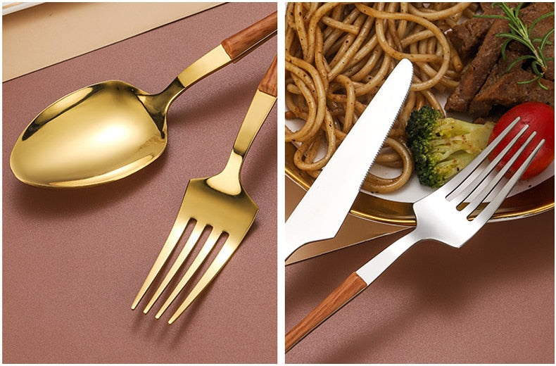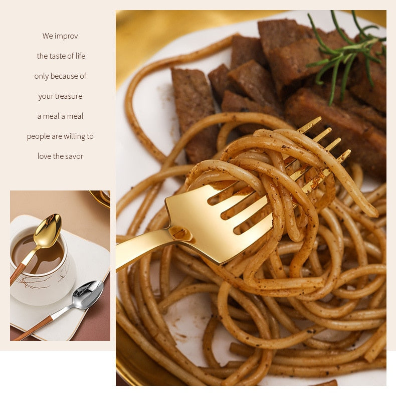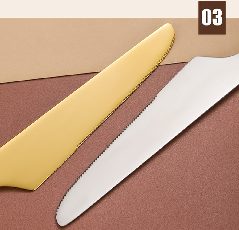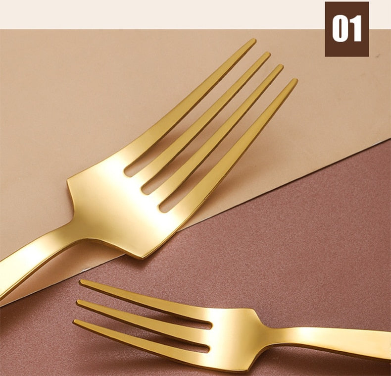 This Golden Cutlery Set timeless elegant design makes it appropriate for formal events or everyday meals. Dishwasher safe for quick, easy home kitchen clean-up. kitchen eating utensil set made in a balanced weight and size, comfortable to use, appropriate weight provides a good sense of balance, the ergonomic arc curve is very suitable for holding, easy for dining.