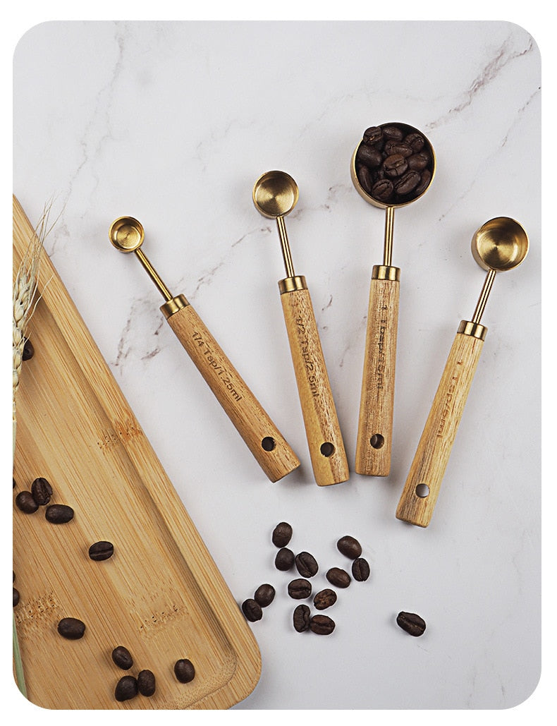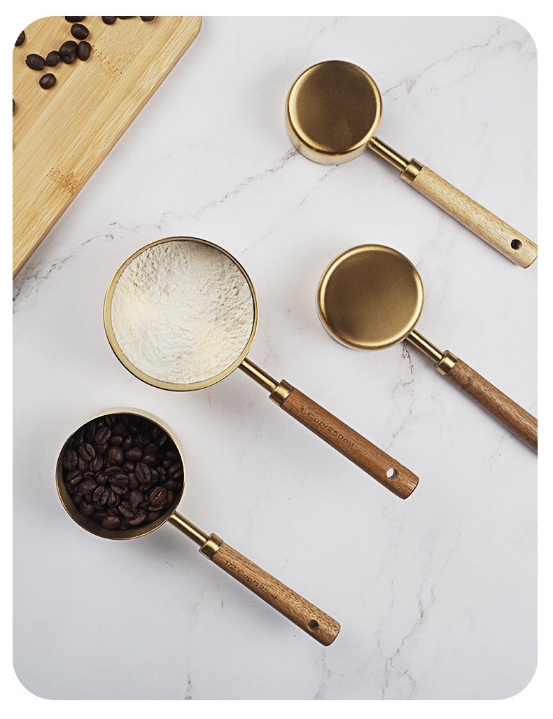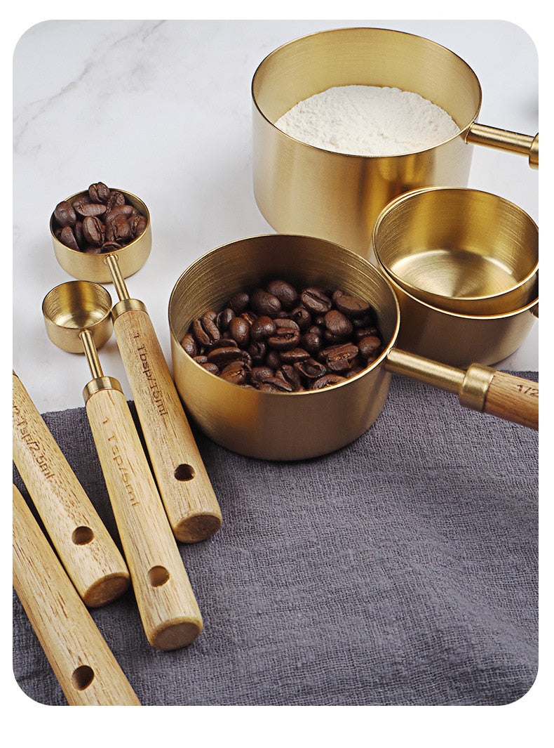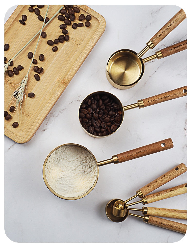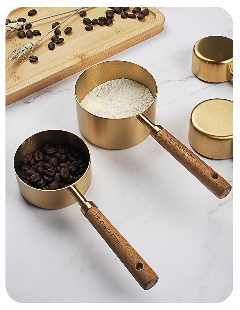Our Stainless Steel Measuring Cups Special wooden handles allow even clumsy fingers to hold tight, and smooth edges eliminate the concerns of the hand injured, conveniently nesting inside one another designs. Each crafted carefully, the outer mirror polish and inner satin polish give them a luxurious look. which will help you reduce any measuring errors for cooking or backing.